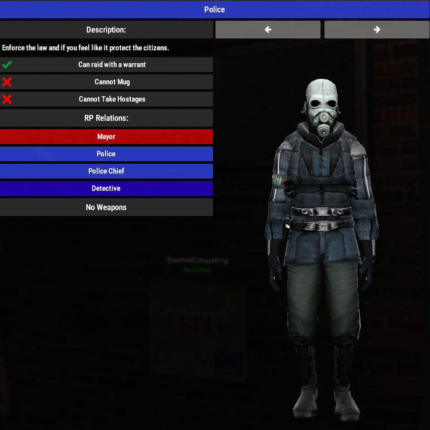 Introduction Video The Police are meant to arrest Criminals, you can tell if someone is wanted by either looking at the wanted list or looking above their player name. Police are the Subordinate of the Mayor and Chief, sharing equal status with the Detective. Police will always spawns with an Arrest Baton, and Stun Baton.